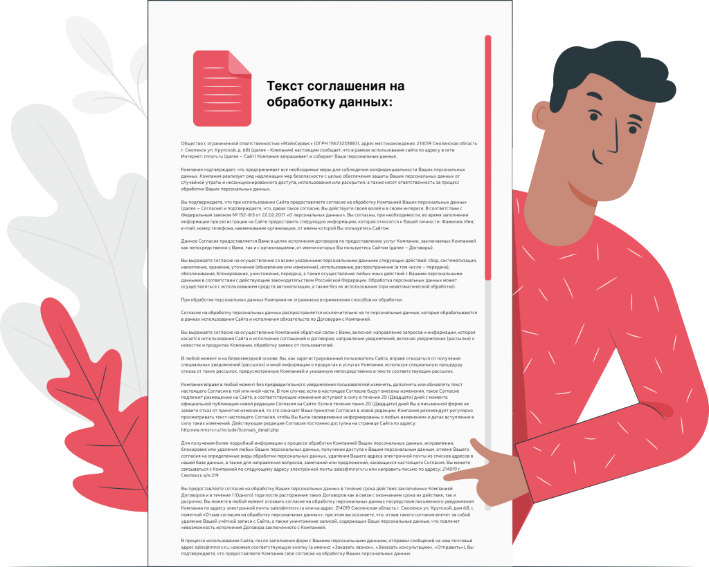 Вы предоставляете согласие на обработку Ваших персональных данных в течение срока действия заключенных Компанией Договоров и в течение 1 (Одного) года после расторжения таких Договоров как в связи с окончанием срока их действия, так и досрочно. Вы можете в любой момент отозвать согласие на обработку персональных данных посредством письменного уведомления Компании по адресу электронной почты sales@mnsrv.ru или на адрес: 214019 Смоленская область г. Смоленск ул. Крупской, дом 68, с пометкой «Отзыв согласия на обработку персональных данных», при этом вы осознаете, что, отзыв такого согласия влечет за собой удаление Вашей учётной записи с Сайта, а также уничтожение записей, содержащих Ваши персональные данные, что повлечет невозможность исполнения Договора заключенного с Компанией.
